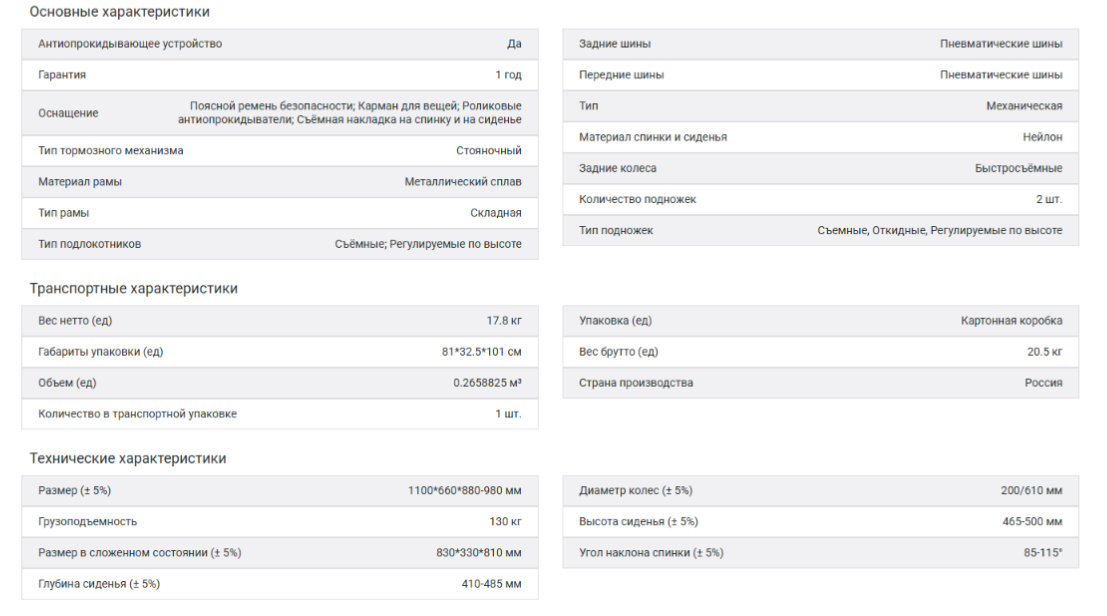 Рама имеет усиленную двойную крестовину и перекладину для дополнительной жёсткости конструкции, что позволяет коляске выдерживать высокую нагрузку. Каркас легко складывается без использования инструментов, что упрощает хранение и транспортировку коляски. Угол наклона спинки можно отрегулировать и зафиксировать в 6 положениях — от 85 до 115 градусов, что позволяет пользователю комфортно расположиться в коляске. Высота спинки относительно сиденья также настраивается. Настраивая колёсную базу, можно отрегулировать высоту сиденья относительно пола и положение колёс относительно спинки для комфортного размещения пользователя в кресле и удобства самостоятельного хода. Подлокотники коляски имеют скошенную форму, позволяющую подъезжать вплотную к столу. Пластиковые накладки на подлокотниках легко чистить. Для защиты от брызг по бокам предусмотрены специальные бортики. Подлокотники регулируются по высоте, откидываются и полностью снимаются, что упрощает пересаживание пользователя. Коляска снабжена подножками с регулировкой угла наклона. Они откидываются и полностью снимаются, а их длина регулируется в зависимости от роста пользователя. Кроме того, подножки снабжены держателями для пяток. Передние колёса коляски манёвренные, а задние — быстросъёмные, что облегчает перевозку и хранение. Сиденье и спинка коляски покрыты мягкими съёмными накладками, которые легко чистить и дезинфицировать. Для безопасности пользователя коляска оснащена роликовыми антиопрокидывателями, стояночными тормозами и прочным ремнём безопасности на застёжке.
