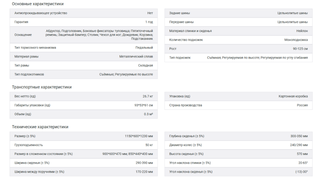 Сиденье и спинка легко и плавно регулируются, что позволяет ребёнку занять удобное положение, где бы вы ни находились. Спинка регулируется по высоте, ширине и углу наклона, сиденье регулируется по глубине и ширине. Общий угол наклона кресла также можно изменять, чтобы малыш мог поспать в коляске. Все параметры настраиваются без усилий с помощью винтовой и рычажной системы. Коляска оснащена съёмным регулируемым по высоте подголовником, мягкими съёмными фиксаторами положения тела по бокам, стабилизатором положения спины и съёмным абдуктором. Всё это делает коляску подходящей для детей любой, даже нестандартной комплекции, а также с различной степенью нарушения работы опорно-двигательного аппарата. Все элементы имеют съёмные чехлы из прочного, легкомоющегося материала. Подножка коляски имеет большую удобную платформу для опоры и регулируемые фиксаторы стоп. Высота подъёма подножки плавно настраивается в зависимости от удобного для ребёнка угла сгибания ног, а длина изменяется по мере роста малыша. Для удобства пересаживания подножка может сниматься. Простота регулировки позволяет легко настраивать положение подножки независимо от того, в какой одежде ребёнок — домашней или уличной. При длительном пребывании в коляске очень важно комфортное расположение рук ребёнка. Модель оснащена удобными съёмными подлокотниками, которые регулируются по высоте. При регулировке ширины сиденья также изменяется расстояние между подлокотниками. Помимо опоры для рук, подлокотники поддерживают положение тела ребёнка и защищают его от брызг. Рама коляски складывается буквально парой движений, без использования каких-либо инструментов, что значительно упрощает хранение и транспортировку. Учитывая небольшой вес рамы, в сложенном виде её легко поместить в багажник автомобиля или убрать на хранение. Все колёса коляски быстросъёмные, что упрощает уход за ними. Цельнолитые шины долговечны и не портят пол. Передние колёса коляски манёвренные, благодаря этому она легко вписывается в узкие повороты. При желании их можно легко зафиксировать в одном положении, чтобы они не поворачивались самопроизвольно, что удобно при езде по прямой и при укачивании ребёнка. Пневматические шины обеспечивают плавный ход даже по неровной дороге. Передние колёса коляски манёвренные, благодаря этому она легко вписывается в узкие повороты. При желании их можно легко зафиксировать в одном положении, чтобы они не поворачивались самопроизвольно, что удобно при езде по прямой и при укачивании ребёнка. Для надёжной фиксации ребёнка в кресле предусмотрен регулируемый пятиточечный ремень безопасности на застёжке, а также съёмный бампер с мягкой накладкой. Для предотвращения непроизвольного движения при остановке коляска оснащена удобным ножным тормозом. Чтобы не поднимать всю коляску для преодоления порогов, на нижней раме есть специальная педаль, позволяющая лёгким нажатием приподнять лишь переднюю часть конструкции. Сиденье коляски легко снимается с рамы — его можно расположить двумя способами: так чтобы ребёнок находился лицом или спиной к родителю. Смена положения выполняется буквально несколькими движениями. Для удобства сопровождающего ручка коляски регулируется по высоте. На ручке расположен удобный подстаканник, куда можно поместить напиток д