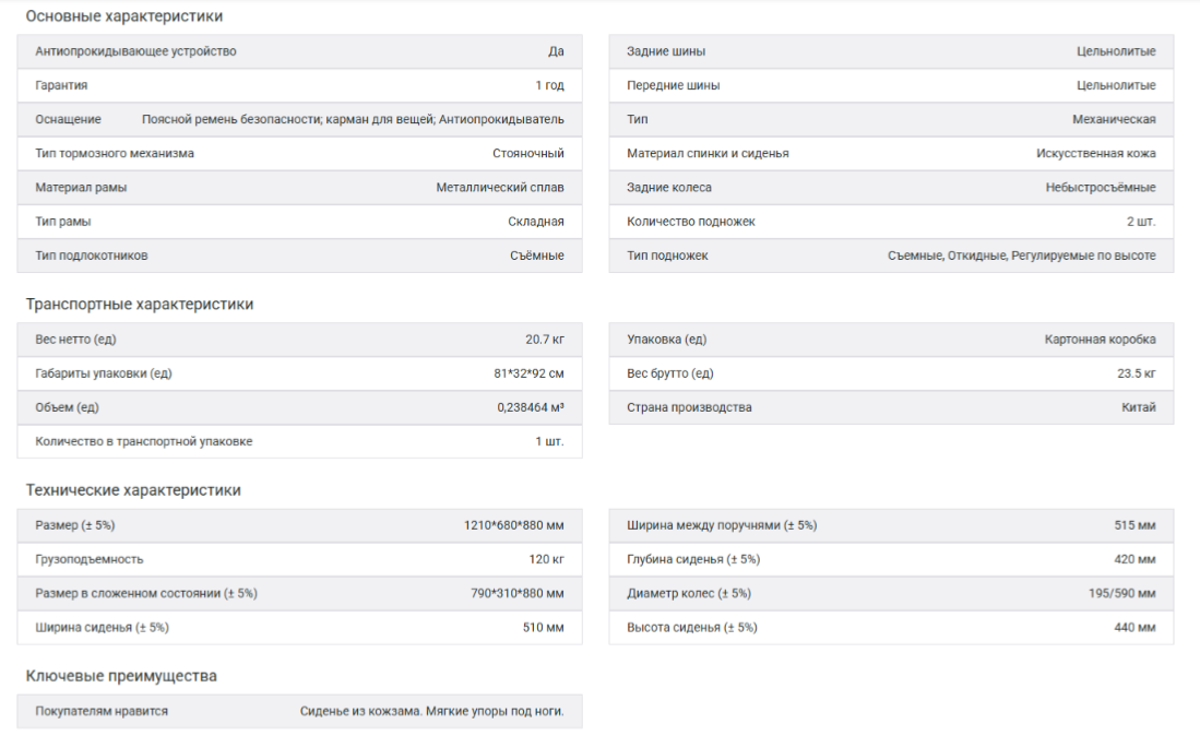 Спинка и сиденье кресла выполнены из прочного кожзама, который не растягивается при длительном использовании, что исключает провисание сиденья и неправильное распределение нагрузки. Ширина сиденья и грузоподъёмность 120 кг позволяют комфортно разместиться в кресле людям средней и крупной комплекции. Задние литые колёса долговечны и неприхотливы в уходе. Колёса снабжены ободами, позволяющими самостоятельно передвигаться и задавать направление движения. Оптимально для использования в помещении или на ровных дорогах. Манёвренные передние литые колеса долговечны, просты в уходе и не оставляют следов на напольном покрытии. Съёмные подлокотники облегчают пересаживание, их ступенчатая форма позволяет вплотную подъехать к столу, а мягкие накладки с обивкой из кожзама служат для дополнительного комфорта при длительном использовании. Подножки кресла снимаются, а также регулируются по длине и подъёму вплоть до фиксации в горизонтальном положении, что удобно при травмах ног. Мягкие опоры для голеней с обивкой из кожзама обеспечивают дополнительный комфорт. Для безопасности на уклонах кресло-коляска оснащено роликовыми антиопрокидывателями. Стояночные тормоза надёжно фиксируют коляску во время остановок. Прочный регулируемый ремень безопасности удерживает пользователя от смещения в кресле. На спинке предусмотрен вместительный карман для нужных вещей. Нескользящие ручки обеспечивают надёжный захват. Кресло-коляска складывается для удобства хранения и транспортировки. Раму можно сложить двумя движениями — надавив на сиденье и потянув за направляющие. Для максимально компактного хранения с кресла снимаются подножки.