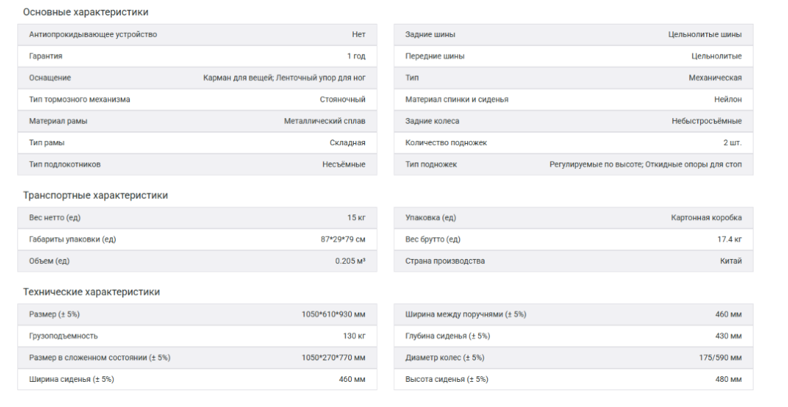 Складная конструкция коляски позволяет компактно хранить её дома или в медучреждении. Кресло-коляска складывается буквально парой движений без необходимости дополнительной разборки деталей. Подножки регулируются по длине с помощью входящего в комплект ключа, поэтому данная модель подходит для пользователей разного роста. Для дополнительного комфорта предусмотрена опора для голеней, позволяющая дольше находиться в кресле без дискомфорта для ног. Спинка коляски складывается. На спинке предусмотрен вместительный карман для нужных вещей. Литые задние колёса оптимально подходят для использования в помещении. Они долговечны, неприхотливы в уходе и не портят пол. Манёвренные передние колёса облегчают управление коляской. Их литые шины прочны и не требуют специального ухода и ремонта. Для удобства пользователя подлокотники коляски снабжены мягкими накладками. Это позволяет дольше и с большим комфортом находиться в кресле-коляске. Для безопасности пользователя с двух сторон сиденья предусмотрены стояночные тормоза, обеспечивающие надёжную фиксацию коляски при остановке.
