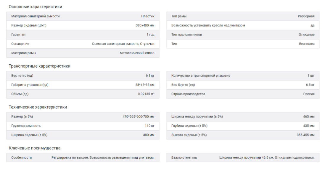 Регулировка ножек кресла по высоте позволяет приспособить стул под физиологически параметры пользователя. Конструкция стула предусматривает возможность размещения над унитазом. Для изготовления каркаса изделия используется прочный металлический сплав, покрываемый антикоррозийным слоем. Срок гарантийных обязательств составляет 1 год. Стульчак и крышка легко снимаются, предоставляя доступ к съемной санитарной емкости. Все компоненты выполнены из прочного моющегося пластика. Откидные подлокотники с мягкими накладками позволяют пользователю садиться в стул как спереди, так и сбоку.
