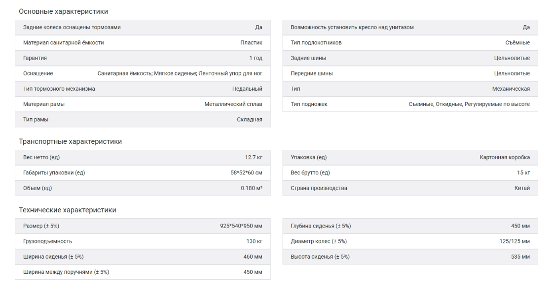 Разборно-складная конструкция позволяет трансформировать кресло в табурет, с лёгкостью пересаживать пользователя, а также компактно хранить и транспортировать коляску. Кресло оснащено пластиковым стульчаком, а также съёмной санитарной ёмкостью с крышкой и ручкой. Она легко устанавливается и моется. Поверх санитарного оснащения располагается удобное сиденье-накладка, покрытое кожзаменителем. Спинка также выполнена из прочного кожзама, который долго служит и легко чистится. Подножки регулируются по длине, поэтому данная модель подходит для пользователей разного роста. Для удобства пересаживания подножки откидываются вбок. Также предусмотрена опора для голеней, позволяющая дольше находиться в кресле без лишнего дискомфорта для ног. Благодаря мягким накладкам на подлокотниках в коляске можно находиться дольше и с большим комфортом. Для удобства пересаживания подлокотники коляски снимаются. Спинка коляски снимается — при снятых подлокотниках и спинке кресло трансформируется в табурет, на который максимально удобно пересаживаться с любой стороны. Литые шины долговечны, неприхотливы в уходе и не портят пол при использовании в помещении. На задних колёсах предусмотрены стопоры для надёжной фиксации коляски при остановке. Благодаря небольшой ширине сиденья данная модель занимает мало места, а также легко проходит в дверные проёмы, что особенно важно при использовании в помещении.