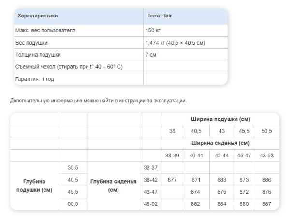 Стандартная комплектация: подушка Terra Flair, вставка ROHO